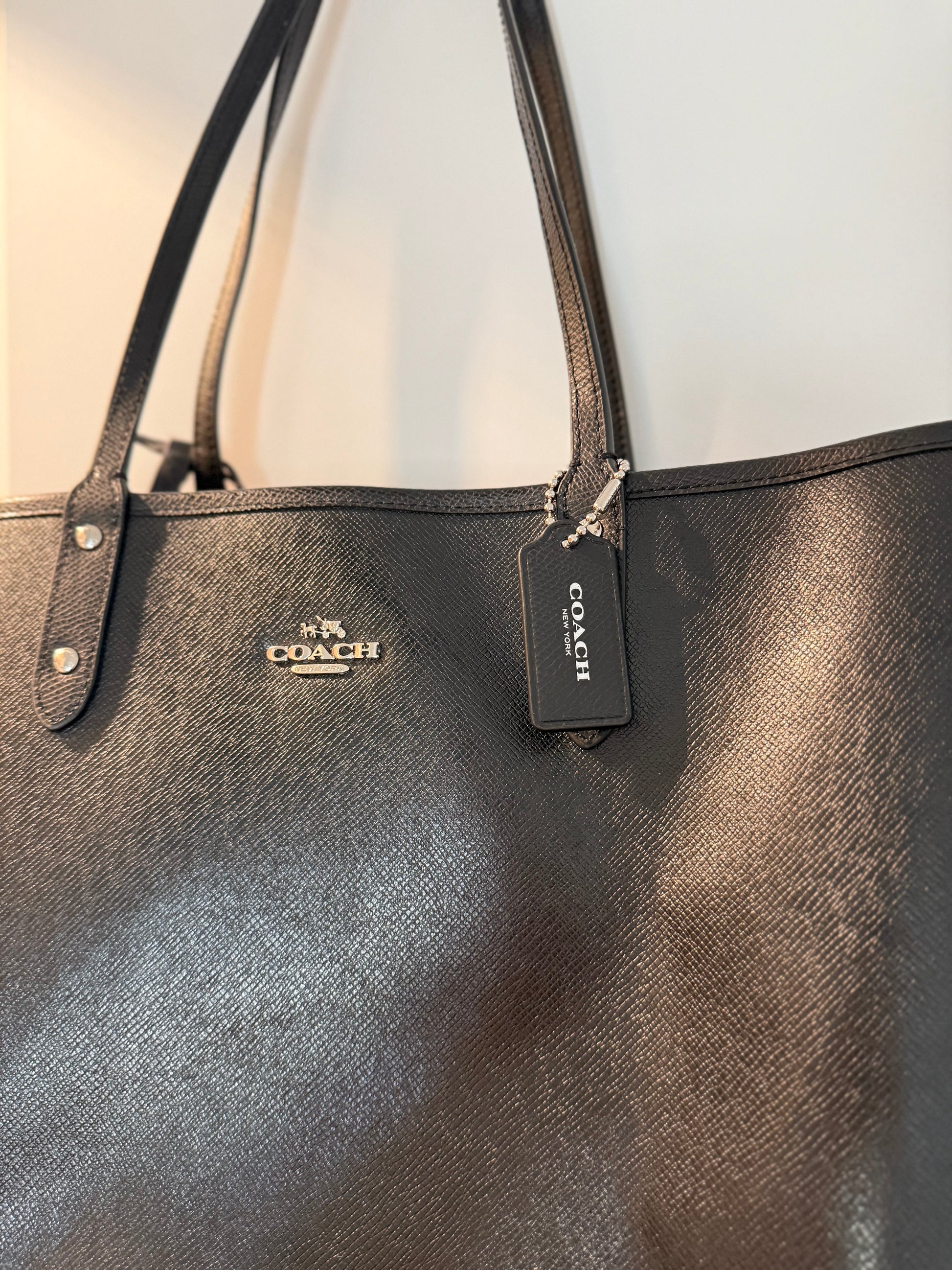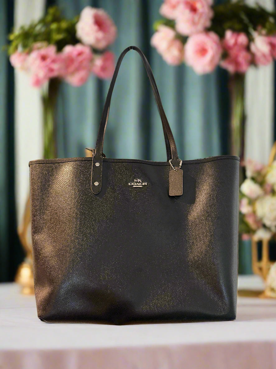 Coach Reversible City Tote with Pouch – Black & Purple Floral Interior – Like New